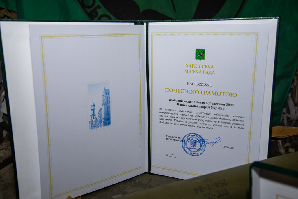 Почесною грамотою Харківська міська рада та Харківський міський голова Ігор Терехов відзначили високий професіоналізм, мужність, відвагу й самовідданість, виявлені бійцями 5-ї Слобожанської бригади НГУ під час захисту територіальної цілісності та суверенітету України.