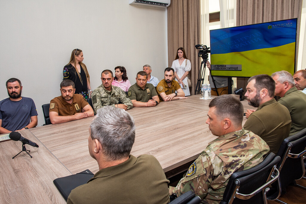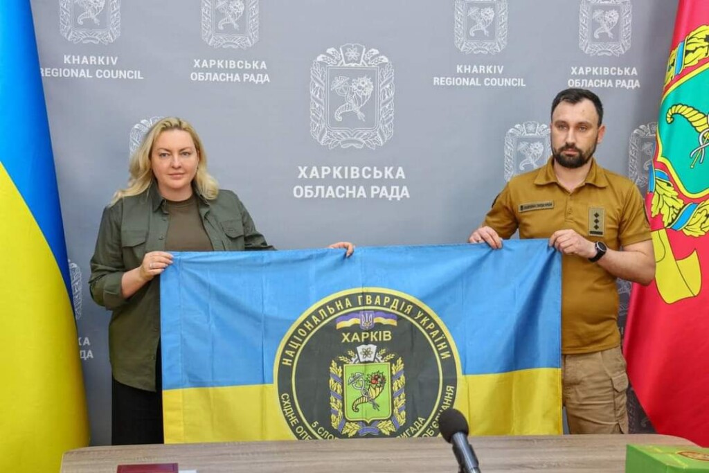 В свою чергу від імені військовослужбовців 5-ї Слобожанської бригади НГУ командир бригади полковник Дмитро Клодчик передав Голові Харківської обласної ради флаг та коїн бригади.
