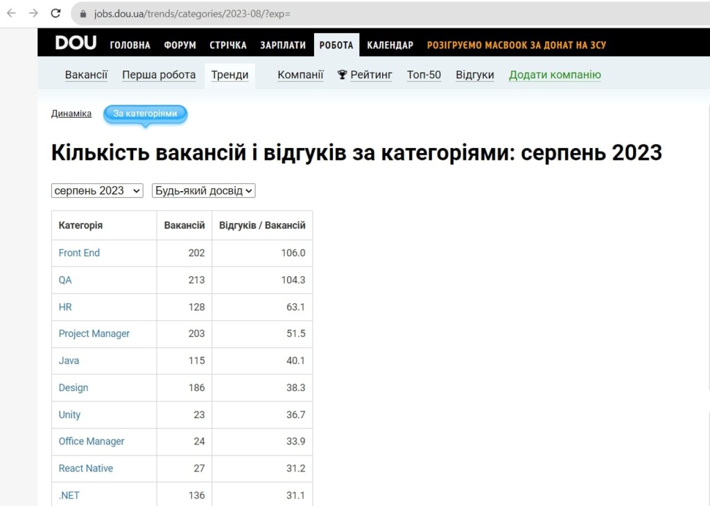 За даними з одного з найбільш авторитетних порталів у сфері IT — DOU, станом на серпень 2023 року, ринок має велику конкуренцію для спеціалістів. Усе більше компаній активно шукають кваліфікованих фахівців, однак кількість IT-спеціалістів істотно випереджає кількість доступних вакансій. Повідомлення про вакансії, які з’являються на ринку, здаються дрібною краплиною в безкрайньому океані кандидатів. На одну вакансію може припадати десяток або навіть більше кандидатів, конкуруючи за цей обмежений ресурс. За таких обставин, навіть для досвідчених IT-спеціалістів вибір правильної можливості може стати справжнім випробуванням. https://jobs.dou.ua/trends/categories/2023-08/?exp=