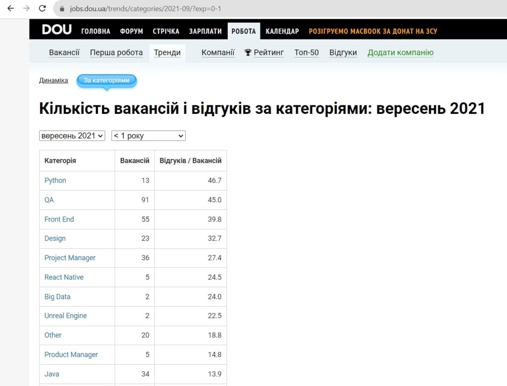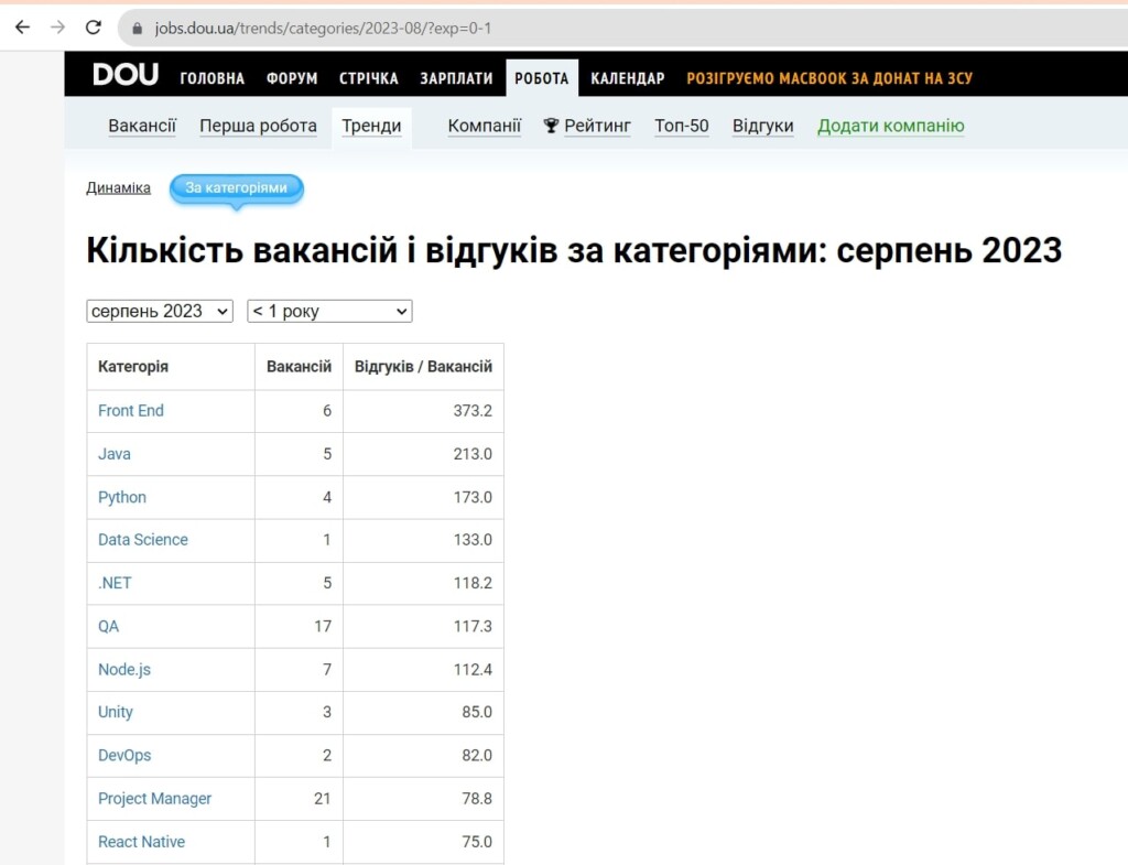 Звуживши критерії до «досвід менше року,» можна побачити, що відповідних вакансій в десятки разів менше, ніж в загальній статистиці. Однак, відгуки від початківців перевищують сотні. Спроба знайти роботу в IT-сфері для Trainee та Junior кандидатів може здатися завданням важчим, ніж коли-небудь. Кількість вакансій для осіб із досвідом “менше одного року” менше, ніж кількість кандидатів, які прагнуть вступити в цей захоплюючий світ. Це створює значну конкуренцію серед спеціалістів, які прагнуть розпочати свою кар’єру в IT.
