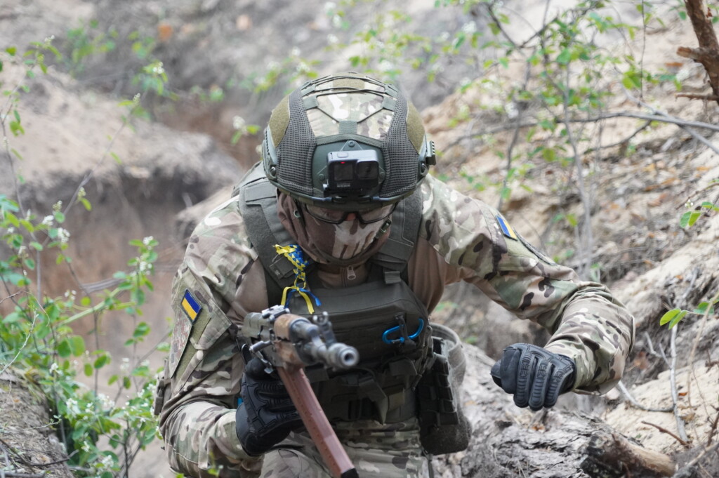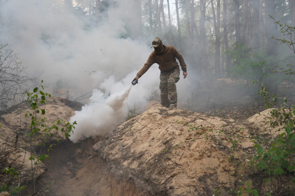 «Працюємо зі страйкбольними приводами. Рухаються по окопу та зверху, тримають комунікацію. Їхня задача – штурм та зачистка окопу. Звільнити простір, щоб могла підійти група закріплення. Працюємо так – п’ять людей у нас в обороні зайняли позиції і дев’ять осіб їх штурмують. Загальний принцип – один до трьох! — пояснює інструктор Дрон.