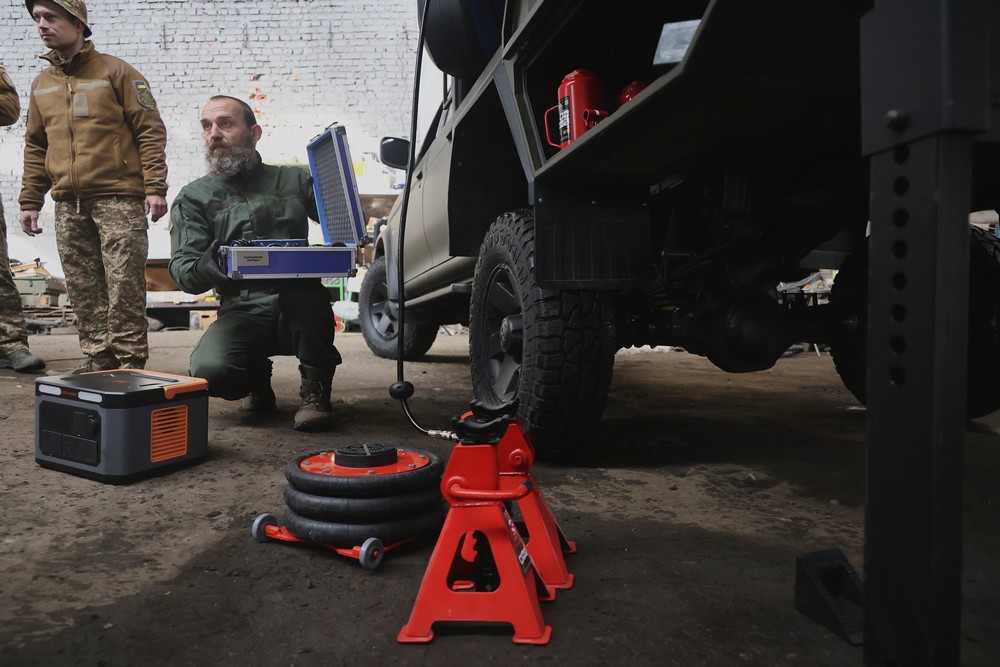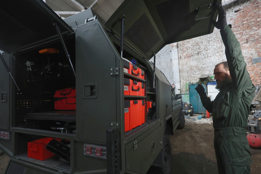 Зібрали його українські виробники. Автомобіль автономний і буквально нашпигований приладдям, щоб якомога швидше відновлювати автівки, а особливо колеса, по яких цілять ворожі FPV-дрони.