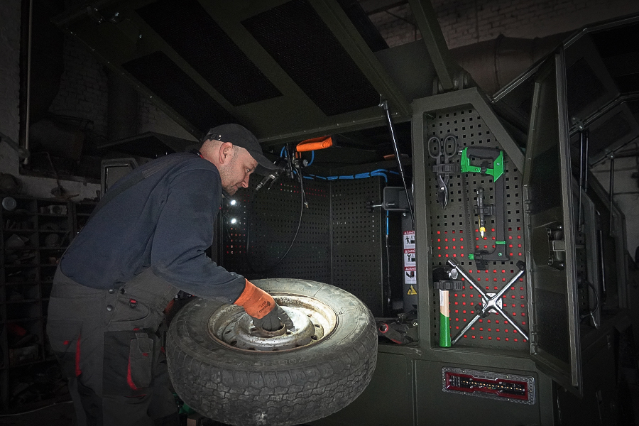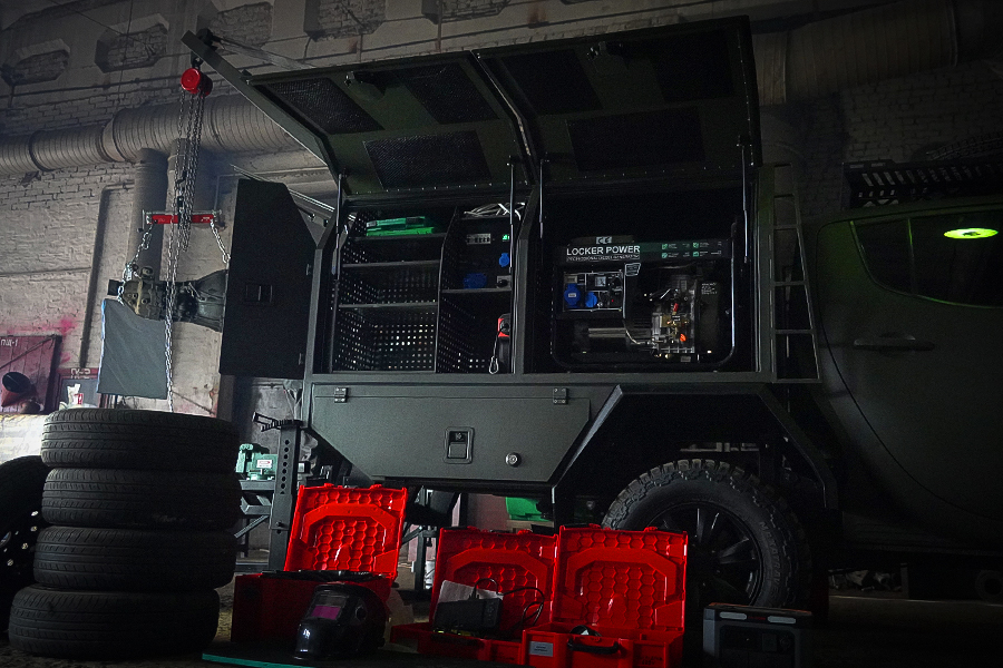 «Ця мобільна майстерня створена на базі автомобіля Mitsubishi L200. Має генератор потужністю 8 кВт, який забезпечує автономну роботу його елементів, які використовуються для відновлення пошкодженого транспортного засобу. Насамперед маємо Launch Control для діагностики несправностей, паралельно є мобільний акумулятор. Ми маємо можливість підняти деталі чи агрегати вагою до однієї тонни. Ми можемо під’їхати щось швидко зняти, встановити відремонтувати паралельно, — розповідає офіцер Східного ТУ НГУ Сергій. — Можемо працювати шиномонтажним обладнанням. Також можемо підкачувати колеса, компресором на 200 л. Є велика кількість інструментів, різні види ключів. Є можливість здійснити підзарядку транспортного засобу чи його примусовий запуск пусковим зарядним пристроєм. Врешті, можемо проводити зварювальні роботи та точильні роботи.Все це втілено у дуже компактній, малопомітній та добре продуманій формі. Основне завдання даної мобільної майстерні — це швидке відновлення транспортних засобів, які виконують бойове завдання»