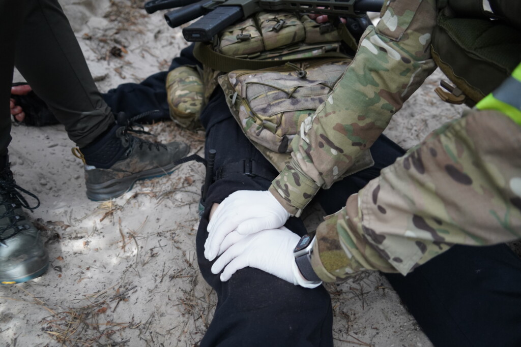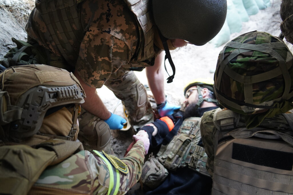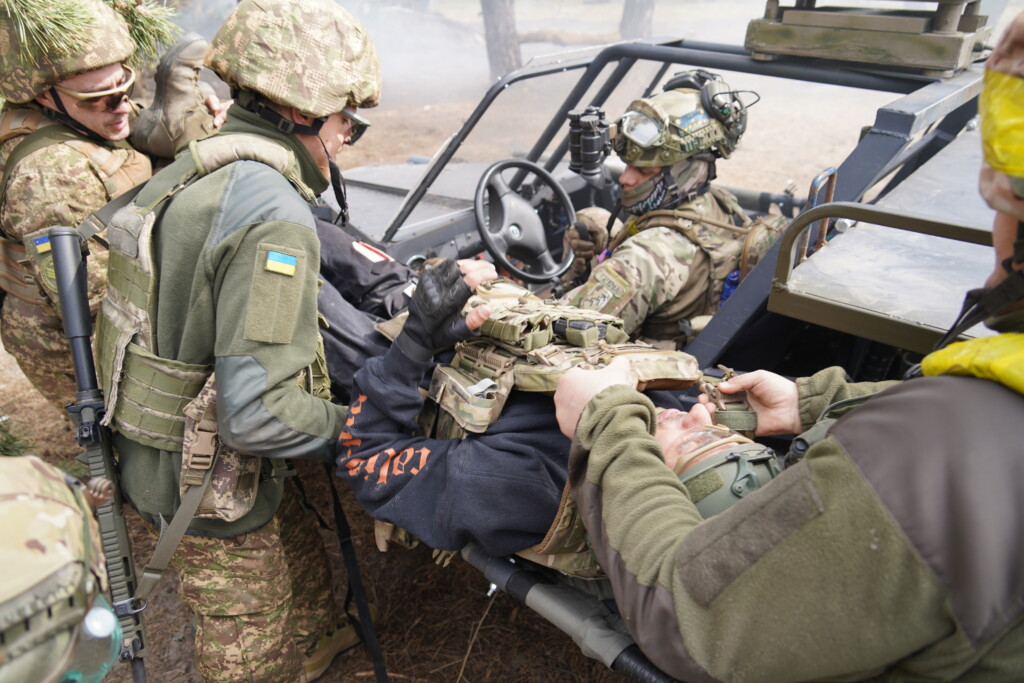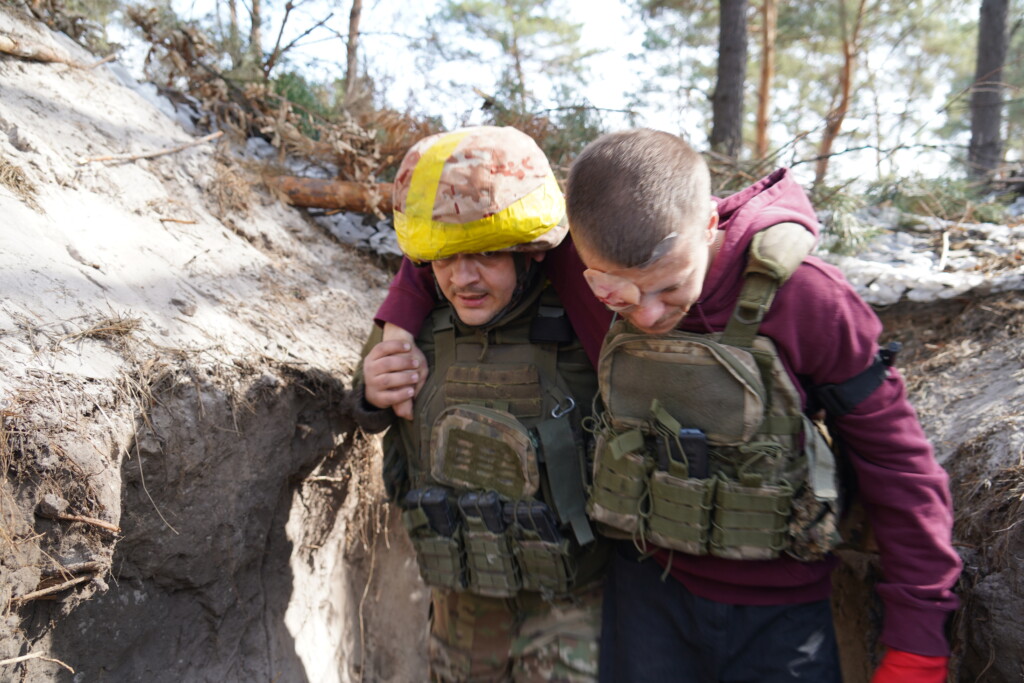 «Там трьохсотий», «Граната», «Лягай!», «FPV», «Швидше!». Вигуки раз за разом лунали в окопі. В умовах імітації бойових дій військовослужбовці «Спартану» вчилися допомагати парамедикам виносити пораненого з поля бою. Курсанти медичного батальйону «Госпітальєри» в цей час відпрацьовували навички надання першої допомоги та евакуації з «нуля» до стабпункту.